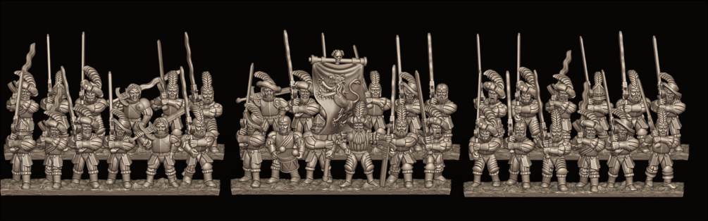 -15 unique Miniatures of Greatswords including a Command Group consisting of an Officer, Musician and Banner (supported and unsupported files included)