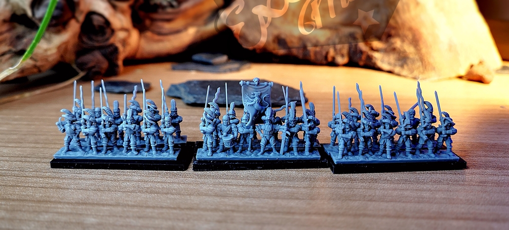 You get the stl-files for a complete unit of Human Heavy Infantry regiment (intended for 10-15 mm wargaming).