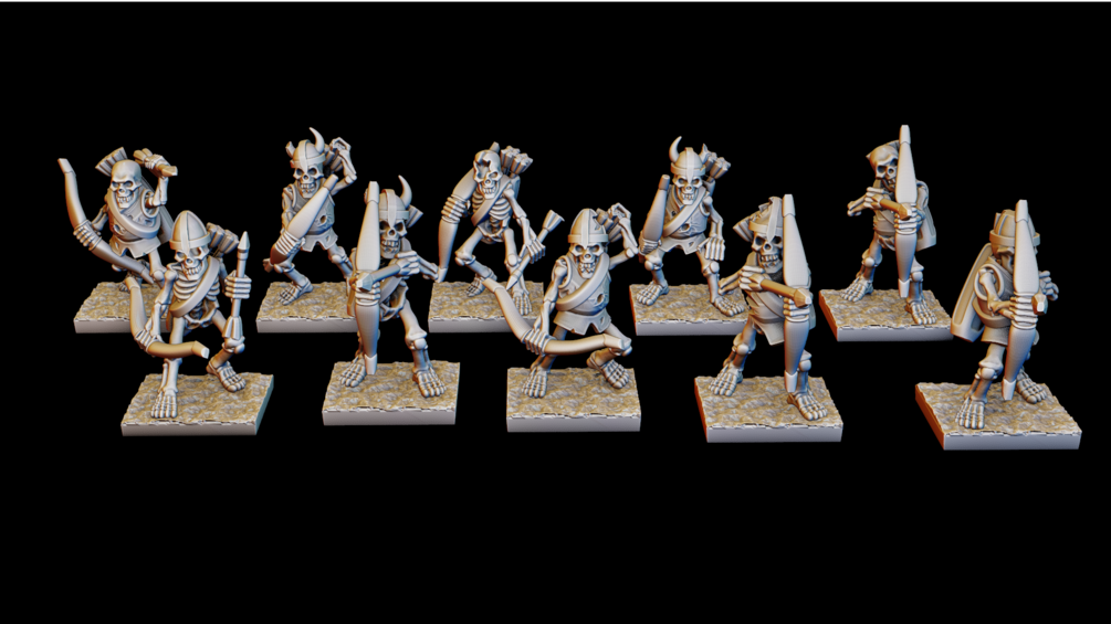 -10 unique individual Miniatures of Skeletons with Bows (supported and unsupported files included)