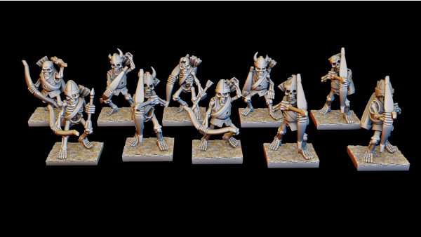 You get the stl-files for a complete unit of Undead Light Infantry regiment (intended for 10-15 mm wargaming).